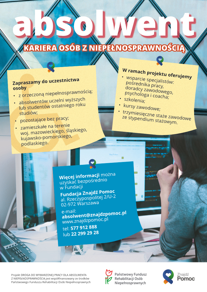 Fundacja Znajdź Pomoc prowadzi rekrutację do projektu "Droga do wymarzonej pracy dla absolwenta z niepełnosprawnością" w ramach programu „Absolwent” współfinansowanego ze środków Państwowego Funduszu Rehabilitacji Osób Niepełnosprawnych.