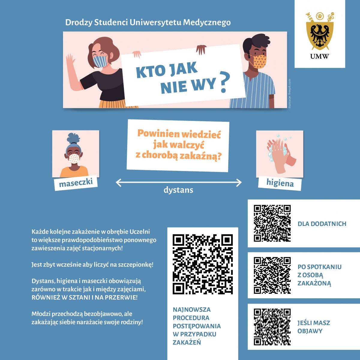 Wiemy jak bardzo zależy Wam na tym, aby Wasza edukacja nie stała się… kolejną ofiarą wirusa. Wiemy, że nauka na naszej Uczelni wymaga pracy z pacjentami i tylko niewielki zakres zadań może być wykonywany zdalnie. Dlatego przypominamy o podstawowych zasadach, których przestrzeganie jest konieczne, abyśmy nie byli zmuszeni do zawieszania zajęć.
