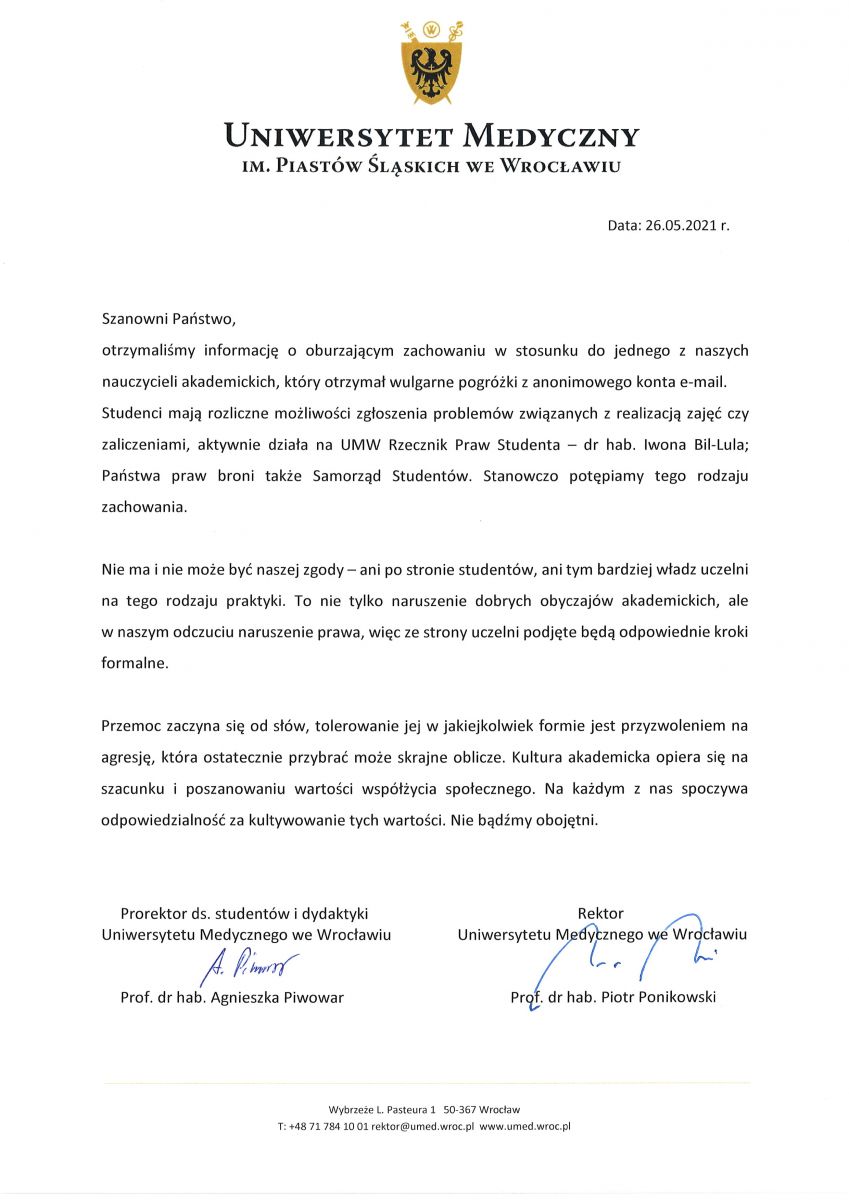 Po otrzymaniu informacji o oburzającym zachowaniu w stosunku do jednego z naszych nauczycieli akademickich, który otrzymał wulgarne pogróżki z anonimowego konta e-mail rektorzy zdecydowanie potępili takie zachowanie.