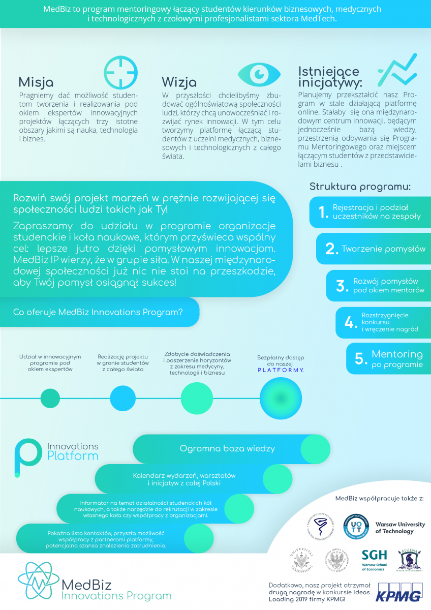 MedBiz Innovations Program 2021 to program mentoringowy dający możliwość rozwoju i komercjalizacji pomysłów pod opieką mentorów - ekspertów z sektora MedTech w Polsce. Łączy studentów z kierunków technologicznych, biznesowych, naukowych i medycznych.