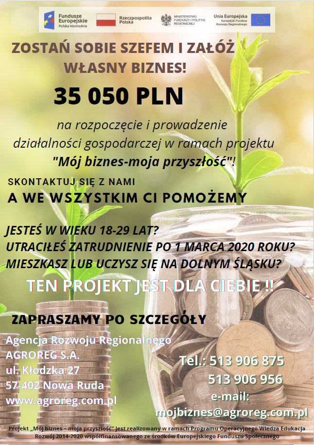Agencja Rozwoju Regionalnego "AGROREG" S.A. w Nowej Rudzie rozpoczęła realizację projektu "Mój biznes - moja przyszłość" dofinansowanego ze środków Unii Europejskiej. W ramach projektu można uzyskać