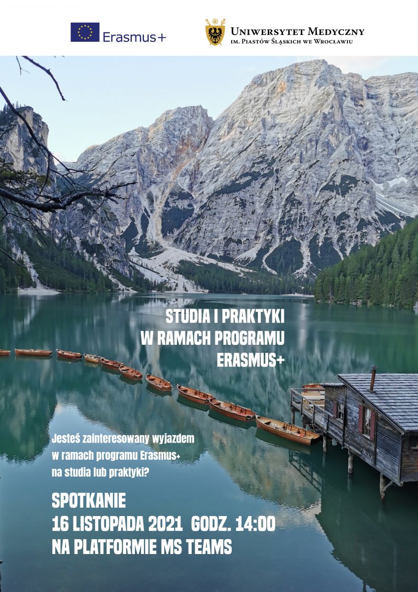Spotkanie dla zainteresowanych wyjazdem w ramach programu ERASMUS+ na studia lub praktyki odbędzie się 16 listopada 2021 (wtorek). Zaplanowano je na godzinę 14:00 na platformie MS Teams.