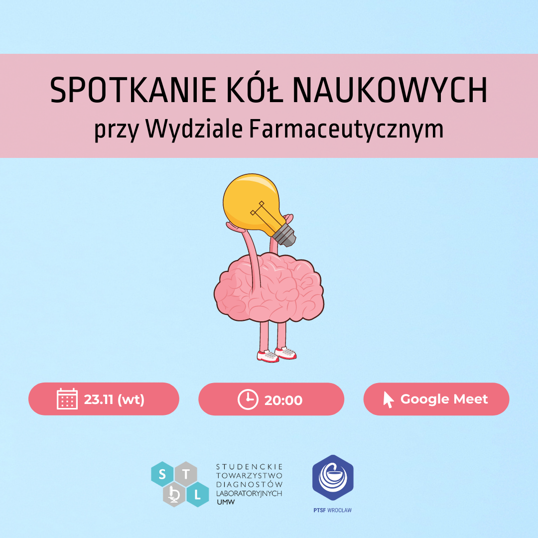PTSF Oddział Wrocław oraz STDL UMW zapraszają na Spotkanie Kół Naukowych przy Wydziale Farmaceutycznym 2021. W trakcie wydarzenia przedstawiciele organizacji zaprezentują swoją działalność oraz odpowiedzą na pytania.