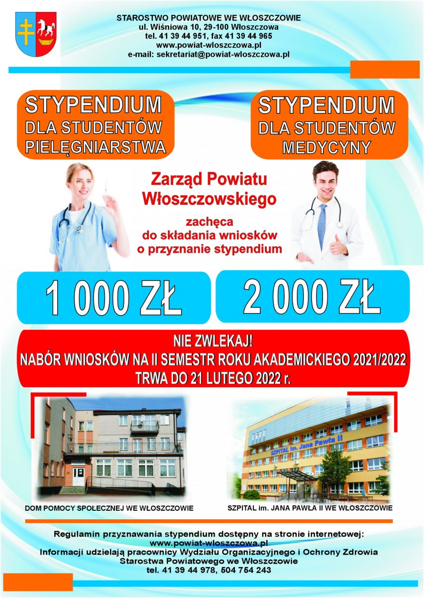 Zarząd Powiatu Włoszczowskiego zachęca studentów kształcących się na kierunkach medycznych i pielęgniarstwa do składania wniosków o przyznanie stypendium. Stypendia są przyznawane na okres 4 miesięcy tj. od 1 marca 2022 r. do 30 czerwca 2022 r.