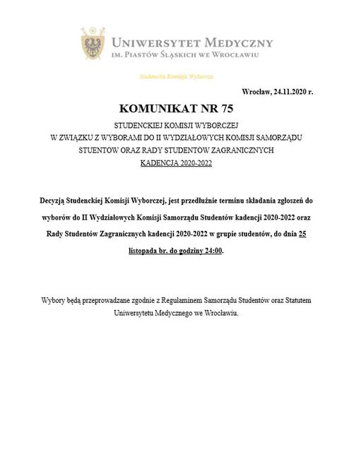 Skany zgłoszeń można wysyłać do Przewodniczącej Studenckiej Komisji Wyborczej - Luizy Leśniak (luiza.lesniak@student.umed.wroc.pl) do godz. 24.00 dnia 25 listopada 2020 r. (środa).