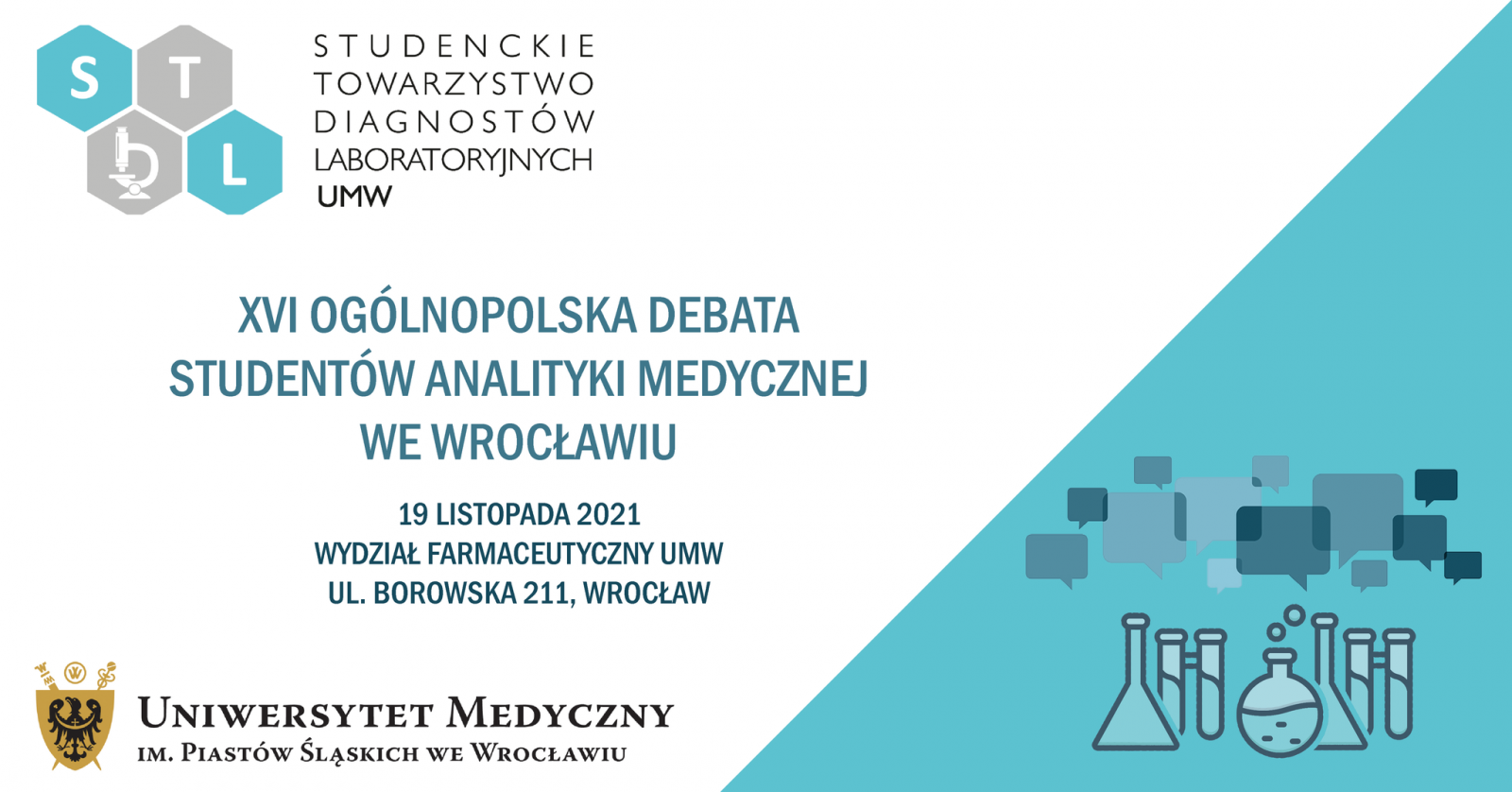 Studenckie Koło Diagnostów Laboratoryjnych zaprasza na XVI Ogólnopolską Debatę Studentów Analityki Medycznej, która odbędzie się 19 listopada 2021 r. na Wydziale Farmaceutycznym UMW przy ulicy Borowskiej 211.